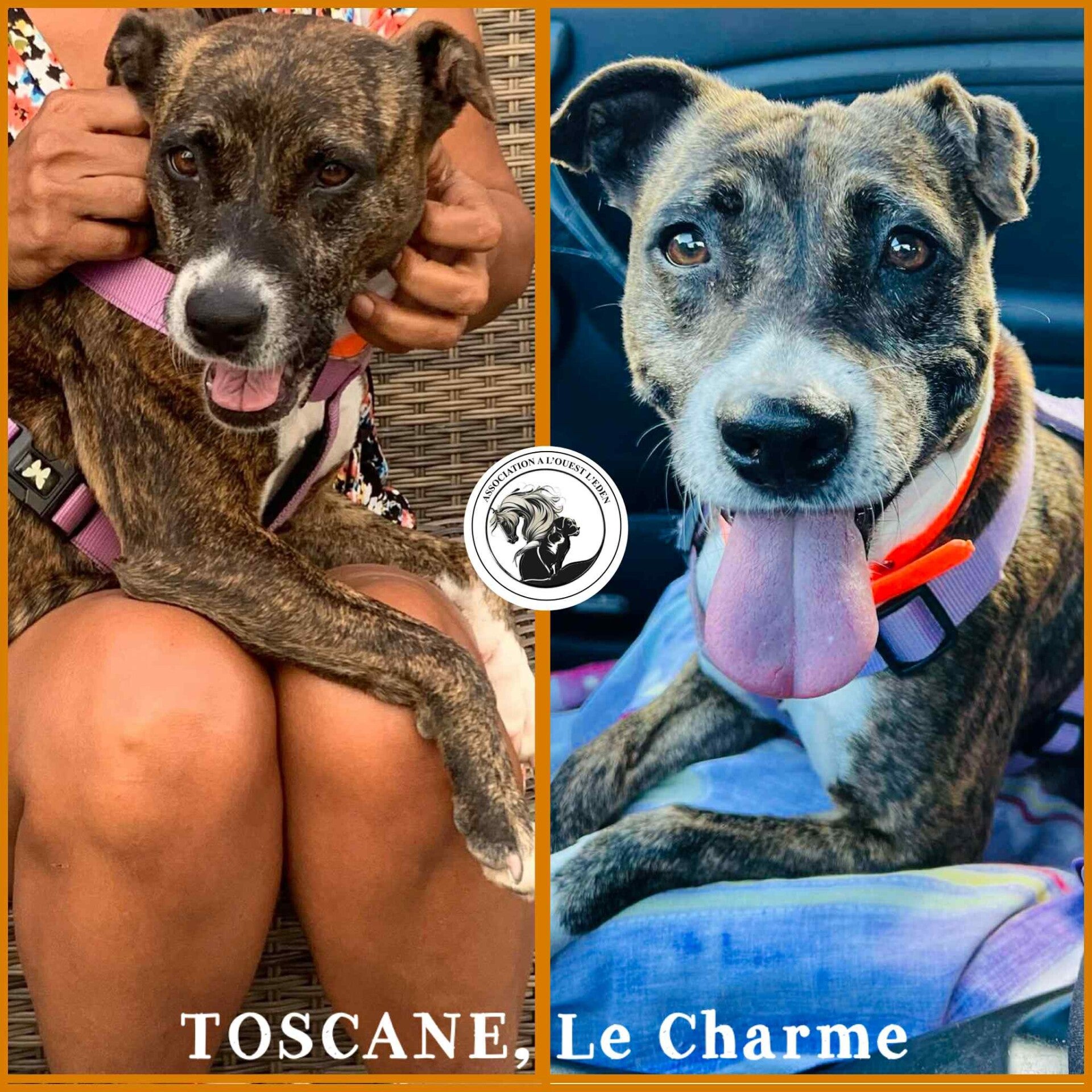 Comportement actuel : Toscane est une chienne adorable avec l’humain et les autres chiens. C'est une puce très demandeuse d’attention, de câlins et d’amour.